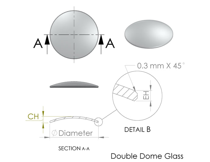 Double Dome Round Sapphire Glass with Polished Edge, 1.0 mm Thick, Center Height 3.0 mm (MOQ: 2 PCS)